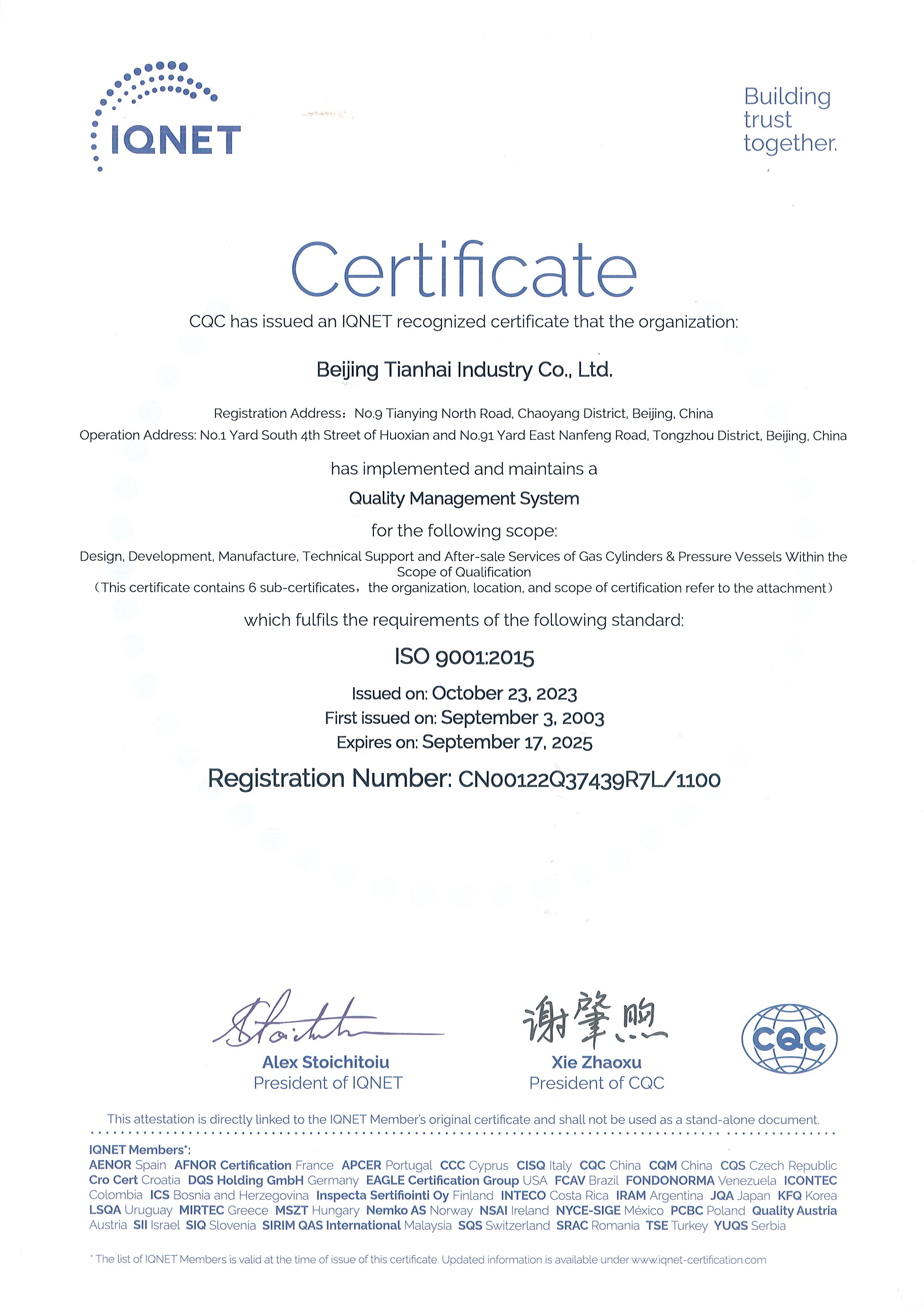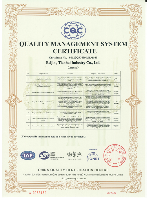 2010年9月,天海工業(yè)為保證品牌質(zhì)量,保證產(chǎn)品一致性,建立了集團一體化ISO9001質(zhì)量管理體系,通過中國質(zhì)量認(rèn)證中心的集團式認(rèn)證并取得證書。